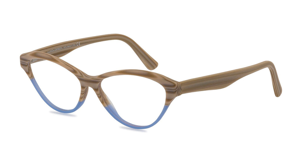 Silvana is a pretty little cat eye shape with a wooden-look upper frame and temples and sky blue lower rim. Perfect for both blue and brown-eyed gals giving a contemporary look to a classic 40s shape. Made in Italy from top quality acetate materials.